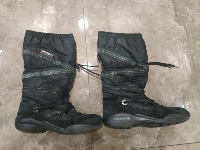Сапожки ecco (екко, еко, экко). Натуральная замша и непромокаемая и непродуваемая ткань. Зимние сапоги, размер 35, длина стельки до загиба 22,5 см. Теплые, не парят, не протекают. Цвет черный. Стельки оригинальные. Идеальный вариант для зимы и осени. Мембрана Gore tex.