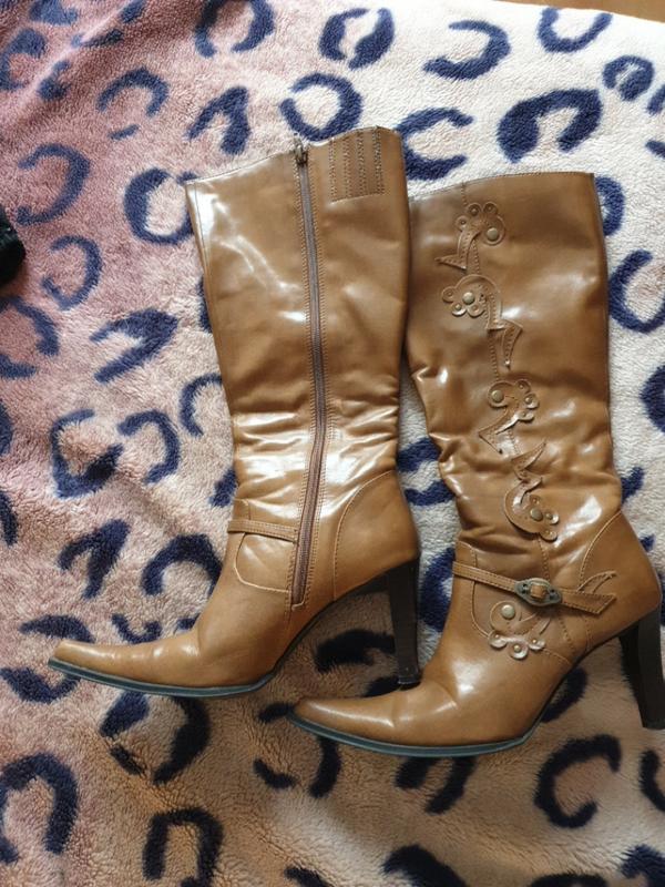 сапоги весенние, искусственная кожа, длинный носок, на каблуке 8 см, цвет светло-коричневый, есть маленький дефект у замка (на фото есть)