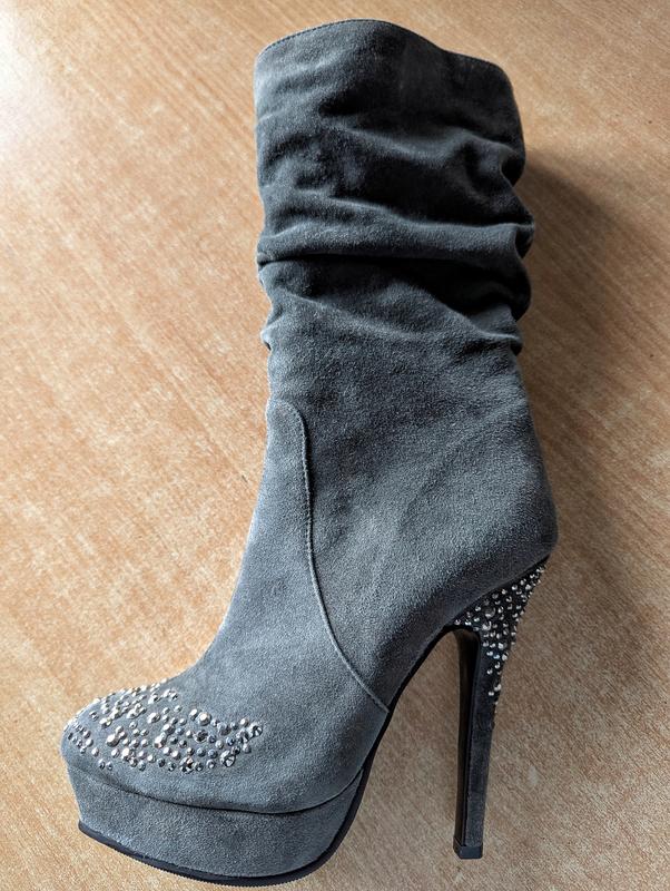 Шикарные ботинки серого цвета на платформе. На носу россыпь серебряных страз. Ботинки лёгкие и мягкие. Подкладка из байки. Удобная колодка. Высота каблука - 11см Высота платформы - 2.5см Распродажа в связи с закрытием магазина.