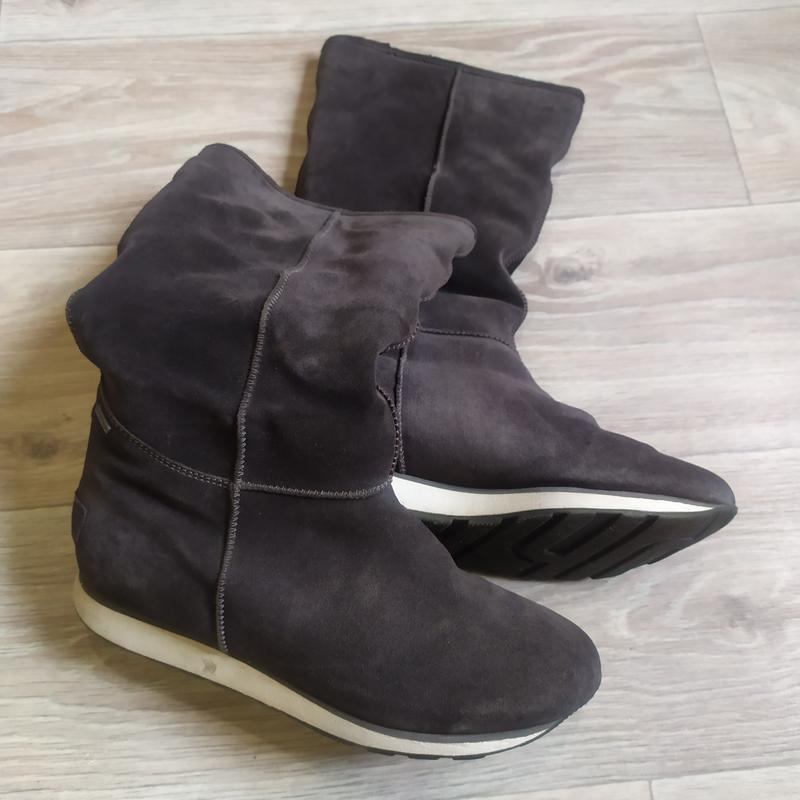 Майже новенькі сапожки з системою gorteх, зверху натуральний замш, темно-сірого кольору. Зсередини штучне хутро. висота сапожка 31 см напівширина верха 17,5 см Підошва товста танкетка