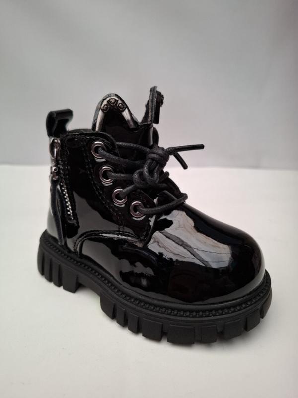 Ботинки теплые стильные детские черные для девочки, демисезон,штучная лаковая кожа, внутри флис,на замочке, застежке,на шнурках,подошва резина,легкие