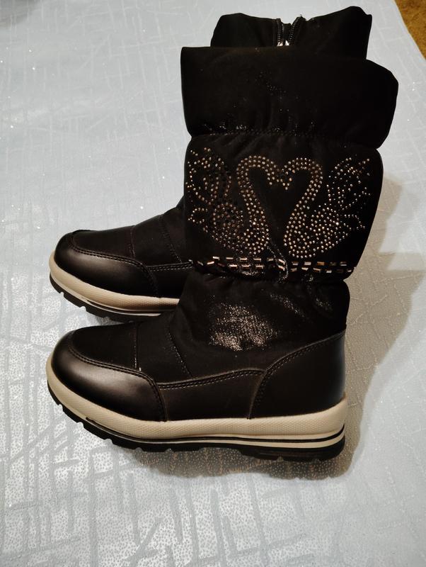 Сапожки зимние на девочку,новые. Застегиваются на молнию. Внутри плотная набивная овчина, верх выполнен из экокожи и водоотталкивающего материала, подошва - морозостойкая резина с хорошим протектором. Размер 33.Высота 29см. Сапоги очень теплые, температурный режим -30С, не тяжелые. Очень красивые