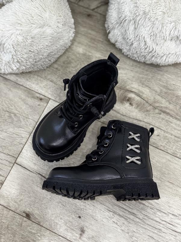Черевики без хутра одягали два рази,тому майже нові. Сезон Демі. Матеріал верху екошкіра. Підкладка та устілка утеплена на флісі. Підошва ПВХ. Черевики на застібці блискавці та шнурівці. 24 розмір : устілка 14-14,5 см.