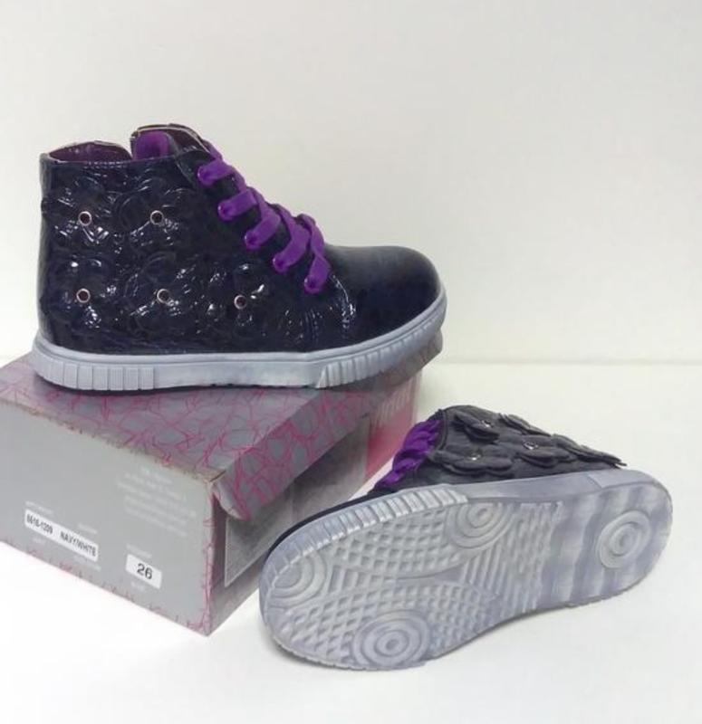 Стильні дитячі черевики для дівчинки в ідеальному стані. • Розмір: 27 (устілка 16,5 см) • Колір: чорний з фіолетовими акцентами • Матеріал: шкіряна устілка, з утепленням байкою всередині, зовні еко-шкіра, прикрашені накладними квіточками з камінцями. • Устілка: з супінатором для правильного формування стопи • Стан: нових, майже не носилися Якісне взуття з ортопедичною підтримкою. Зручна посадка, надійна фіксація стопи. Підходять для щоденного носіння в прохолодну погоду. Практичне поєднання комфорту та стилю для активних дівчаток.