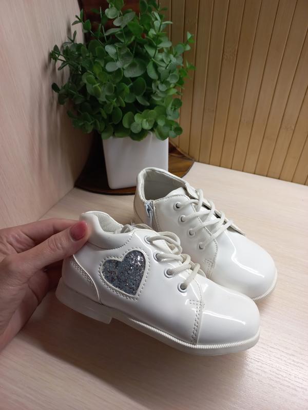 Очень красивые лаковые ботинки для маленьких девочек. Обувь светло -молочного цвета, это придаст образу свежесть и индивидуальность. Украшенная модель сбоку сердечком с лазерными паэточками. Надежная шнуровка поможет отрегулировать полноту по ноге, а для ежедневного обувания есть застежка молния. Каблук Томаса. Внутри не утеплены. 15,5 см стелька Легко дополнят шиком любой лук. Отличное качество детской обуви для Вас по доступной цене.