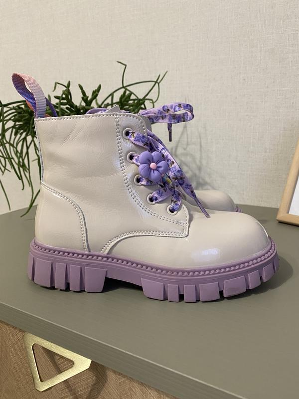 Очень красивые, а главное удобные сапоги для девочки. Цвет молочный, лаковое покрытие, очень качественные. В середине мягкий тонкий плюш. Одягали 1-2 рази. Стан идеален. Размер 30, длина стельки 18.5 см.