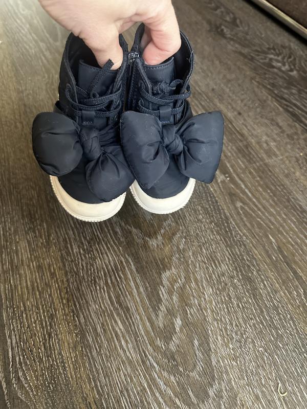 Черные ботиночки с бантами 23 размер, примерно 14 см. Мы носили с 2-х рочков, там и шнур резинки и молния, что удобно.