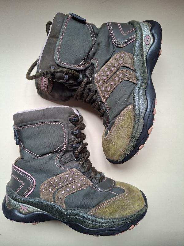 Ботинки Geox с мембраной shoe-tex для девочки в красивом состоянии. С не очень внушительными следами эксплуатации ( цвет замши бледнее и др) Сезон: осень/ зима/ демисезон. Верх: синтетический текстиль с мембраной + натуральная замша+искусственная кожа+стразы. Подкладка флис+стелька из войлока. Размер 27 Длина стельки 17 см+ 1 см загиба. Вшитый язычок.