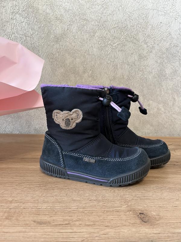 Теплі чобітки, які надійно захистять маленькі ніжки від холоду і негоди. • Розмір: 24 ( довжина устілки 15 см). • Верх: натуральний замш і спеціальна технічна тканина, яка не пропускає воду. • Всередині: утеплений текстиль з мембраною goretex. — Без дефектів, фурнітура справна.