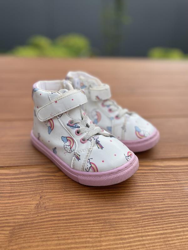 Гарні черевики (хайтопи) на дівчинку білого кольору з веселками. Підійдуть на осінь. Застібаються на липучку. Розмір 26, повна стелька 16,7 см (виробник зазначає 16,3). Бренд - LC Waikiki.