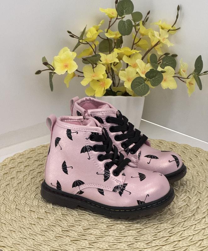 Стильні рожеві дитячі черевики з принтом парасольок. Виготовлені із екошкіри, Утеплені флісом, устілка шкіряна- з супінатором Для фіксації присутня шнурівка та бокова блискавка. Черевики легкі та зручні. 22 розмір- 14,5 см 23 розмір -15 см 24 розмір - 15,5 см 25 розмір -16 см 26 розмір 17 см