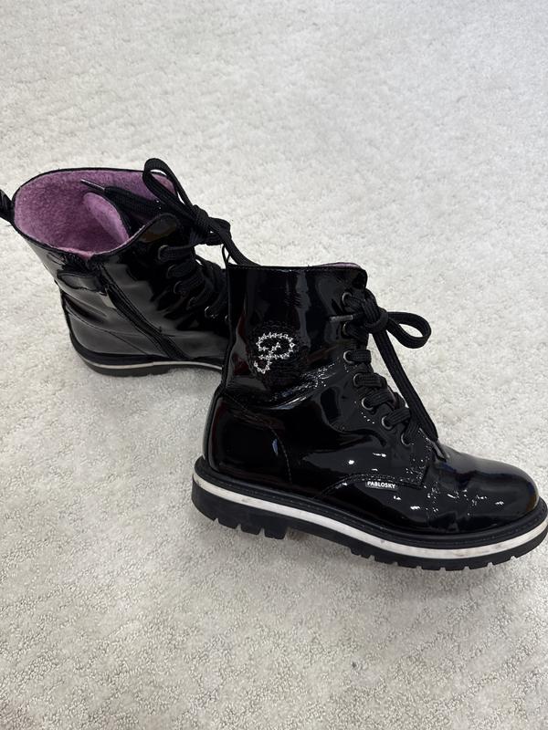 Дитячі лакові дуже стильні черевики на шерстяній підкладці,шкіра лакована без дефектів та без тріщин,тільки на підошві де біла резина є чорні подоси потрібно відчистити, розмір 35 довжина устілки 22 -22,3см