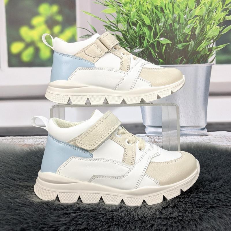 Детские демисезонные ботинки для девочки Мальвы. Дизайн и Материалы: Цвет: Ботинки выполнены в приятной комбинации белого и светло-бежевого цветов. На боковой части присутствуют акцентные вставки нежно-голубого цвета. Верх: Изготовлен из натуральной кожи. Подкладка: Полностью из натуральной кожи. Стелька: Натуральная кожаная стелька со встроенным супинатором. Застежка: Удобная система застежки на липучке и эластичных шнурках. Подошва: Прочная и гибкая подошва из ПВХ (поливинилхлорида) светло-бежевого цвета, высотой примерно 1,5-2 см. Имеет выраженный рельефный протектор. Размерная сетка (длина стельки): 29 р. = 18,3 см 30 р. = 19 см 31 р. = 19,5 см 32 р. = 20,2 см 37 р. = 23,5 см Перед оформлением заказа уточняйте наличие размера!!! Замеры стельки делаем сами, вручную. Отправка Новой или Укрпочтой. Оплата осуществляется на карту Приват банка, или наложенным платежом, с минимальной предоплатой на доставку. Или же можете воспользоваться безопасной оплатой через Шафу.