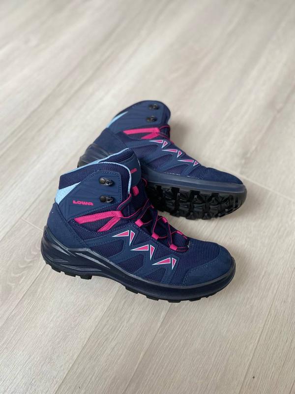 Верх текстиль + экоматериалы Имеют мембрану Gore-Tex, не промокают Носочки и пятятка уплотненные Стелька анатомическая Фисируются с помощью снорков + 2 люверсы в конце шнуровки Подошва с надежным протектором Производитель Словакия Цвет темно-темно синий + малиновый + голубой долж стельки от края до края 24.3, ширина 8.5, высота 11 по заднику