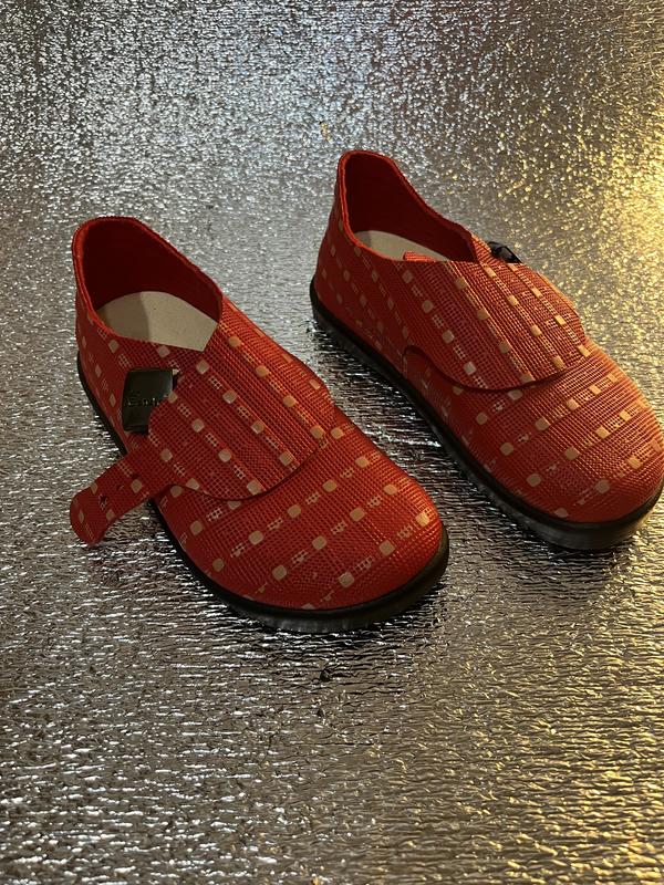 * Черевики яскраво-червоного кольору з візерунком у вигляді бежевих квадратиків. Мають відкритий дизайн у верхній частині з однією широкою липучкою для фіксації на нозі. На липучці є металева пряжка з написом, схожим на "BETULA". * Бренд: Устілка взуття маркована брендом Betula, а також містить напис "ORIGINAL BIRKENSTOCK FUSSBETT" і "MADE IN GERMANY". Це вказує на те, що взуття вироблене в Німеччині і має оригінальну устілку Birkenstock, відому своєю ортопедичною формою. * Розмір: На устілці вказані розміри: 33 (європейський розмір), 210 (довжина устілки в мм) та 10 (американський або британський розмір). Також є позначка "L2". Взуття виглядає легким та дихаючим, що робить його придатним для носіння в теплу пору року.