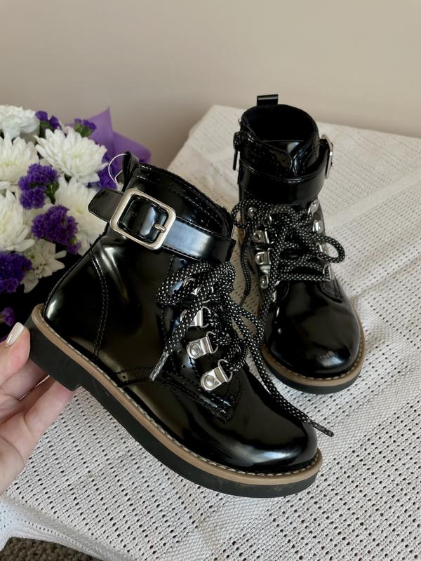 Осінні демісезонні черевички на дівчинку, утеплені мікрофіброю Матеріал штучна лакована шкіра Декоровані ремінцем Шнурки функціональні, та окрім них є змійка з внутрішньої сторони Дуже симпатично виглядають Розмір по етикетці 28 (17,5см) По факту стелька має 18 см Стан гарний, єдина коцка на лівому носку