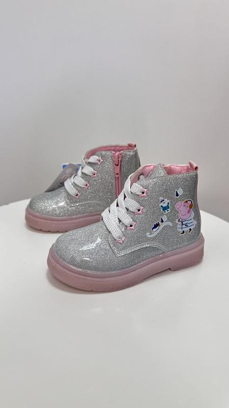 Осінні ботіночки для дівчаток з Пепою від бренду George. Легенькі і зручні.Підошва не важка. Якість відмінна. •Застібка змійка + шнурків. •Глітерний верх •Текстильна підкладка всередині. Розміри: 24-15 см