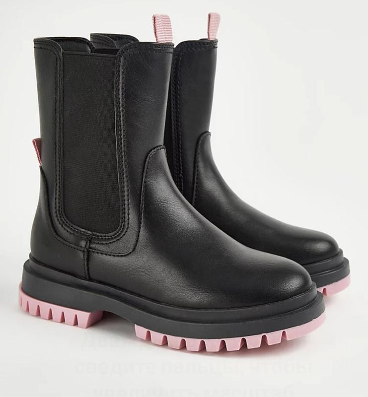 Тип обуви: Ботинки на массивной легко одевающейся подошве (pull-on boots). Цвет: Черный с розовой подошвой. Бренд: George Размер: 34 (детский). Особенности: Массивная подошва для лучшего сцепления и современного вида. Конструкция без шнуровки для легкого надевания и съемки. Имеют эластичные вставки по бокам, характерные для ботинок челси, что облегчает одевание. Розовая подошва добавляет яркий акцент к классическому черному цвету.