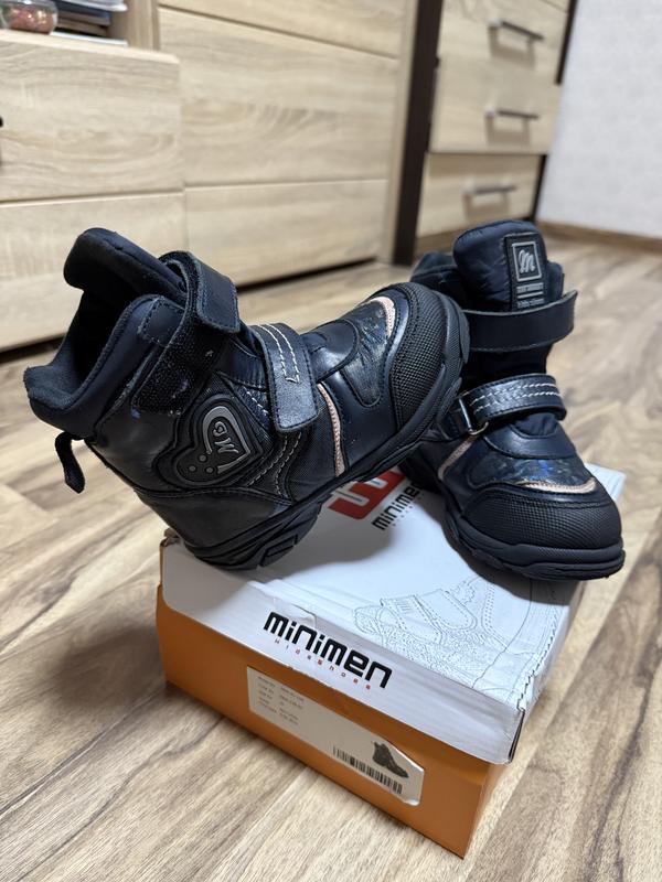 Зимові черевики Minimen теплі та зручні, 25 розмір, 16,5 устілка. Верх взуття виконаний з натуральної шкіри зі вставками мембранного текстилю, всередині підкладка – натуральне хутро (цигейка). Перед та задник черевика захищені накладками, стійкими до подряпин та пошкоджень. Черевики мають знімну ортопедичну устілку з супінатором з натурального хутра (цигейка). Зручна система фіксації – дві липучки, що дозволяє швидко одягати взуття. Підошва рифлена, язичок черевика пришитий до взуття по всій довжині для захисту від попадання води та снігу.