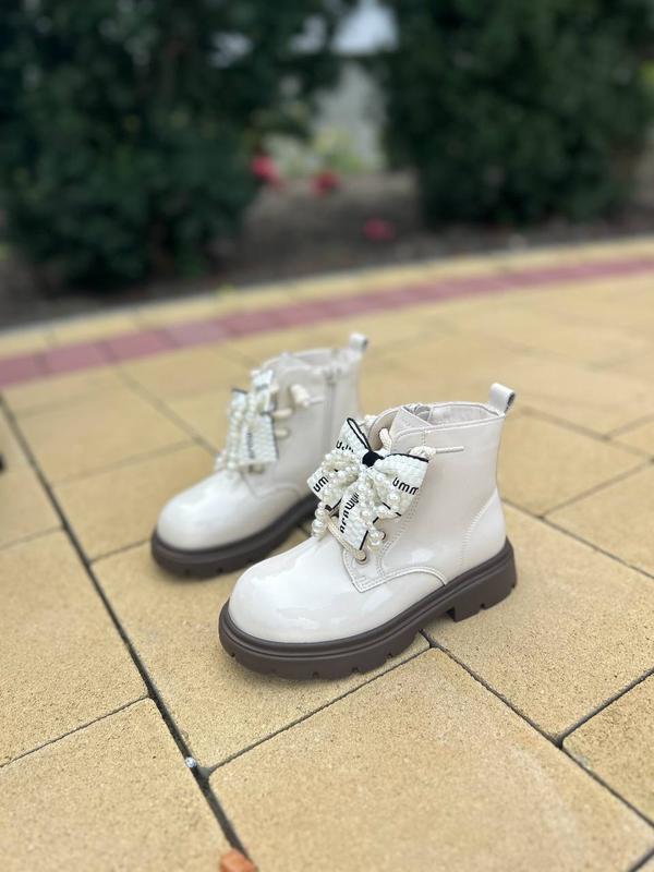 Виготовлені із мʼягкої лакованої екошкіри . Середина утеплена флісом. Повнота ніжки регулюється шнурівкою . Присутній боковий замочок. Легкі та стильні. Прикраса знімається. 31- 20 см 32-20,9 см 33-21,6 см 34-22 см 35-22,5 см