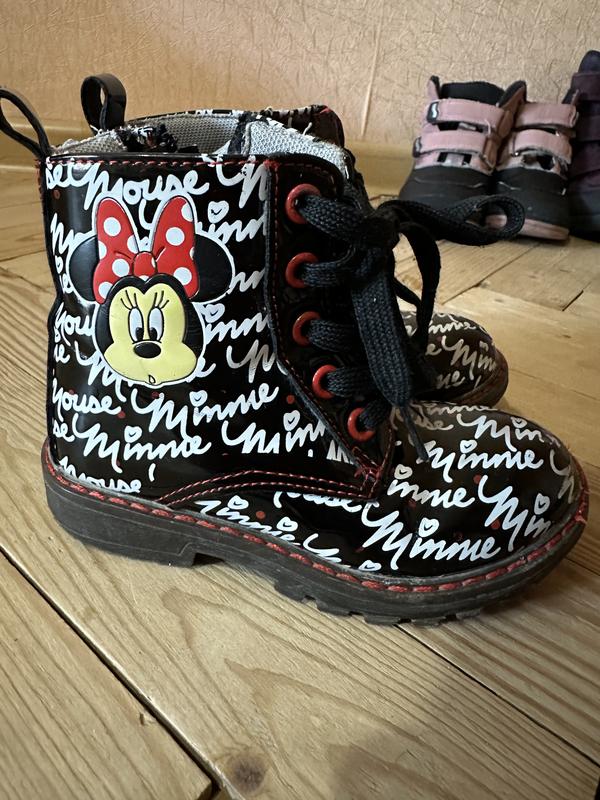 Черевички Міккі Маус для дівчинки, розмір 24 (підошву заміряла - 17 см, приблизно 16 по устілці десь буде) Стан 8/10 Колір чорний з надписами білого кольору Є незначні нюанси, на фото показала, але на носіння це не впливає і із неозброєним оком навіть не помітно. Звертайтеся за додатковою інформацією.
