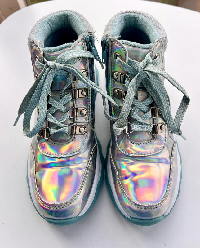 Можно сміло сказати, що вони абсолютно нові, вдягались максимум 1/2 рази, а так більше простояли, ніжка швидко виросла, на високій крутій підошві, тракторній, не склизьки, зручні, легкі, не важкі. Всередені утеплювач і теплі устілка. Самі по собі сріблясті й переливаються від жовтих до синіх кьольорів, можна сказати всіма кольорами райдуги , не промокають, дуже якісний матеріал покриття. Ще дуже зручна для дитини застібка через молнію збоку, шнурки розвʼязувати чи завʼязувати не потрібно, то декор Розмір -34 Київ