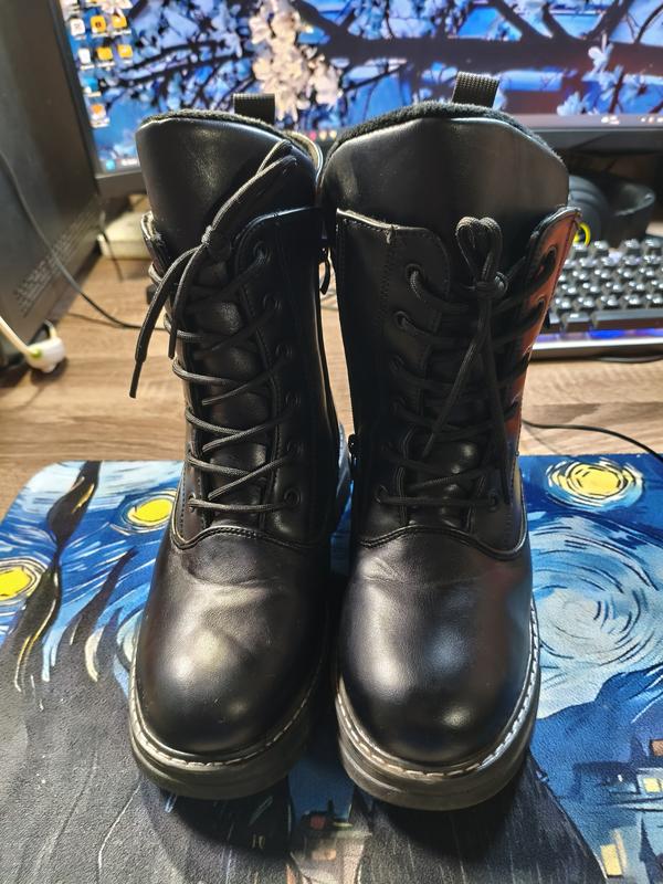 Теплые зимние берцы, почти в идеальном состоянии. Ребенок одевал их 2-3 раза. Нет никаких потертостей, царапин. Подошва тоже целая. Замки исправные. По стельке 23см.