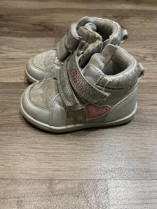Кросівки дитячі 22 розмір Бежево-золотисті кросівки з блиском і рожевими сердечками. Зручні липучки, м’яка устілка, легкий супінатор. Підійдуть для прогулянок у демісезон. Передки трохи збиті, загальний стан добрий.