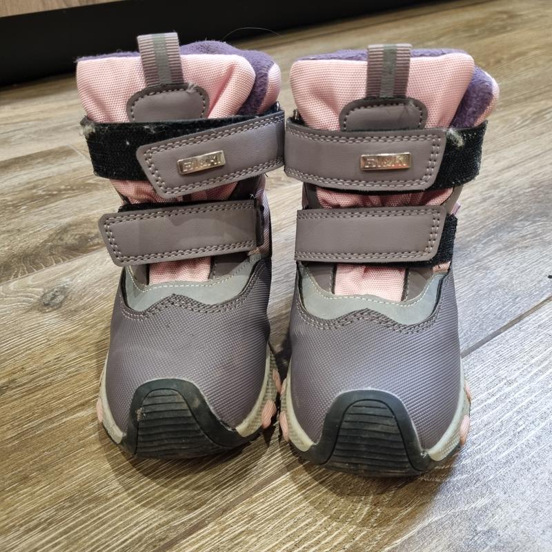 Ботинки для девочки водоотталкивающие,плюс светоотражающая лента, очень теплые.Детина отходила сезон с сухими ножками, легко имеются, протереть и все.В середине на меху.Размер 28.