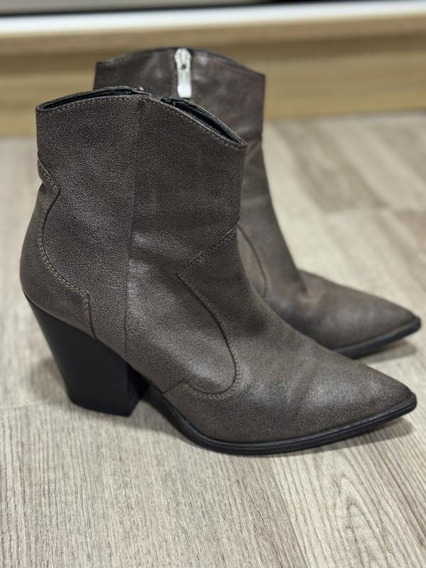 Стильні ботильйони з якісної еко-шкіри під замшу. Мають трендовий ковбойський силует із гострим носком і масивним підбором, який додає образу шарму та впевненості. Зручна застібка-блискавка збоку забезпечує комфорт у щоденному носінні. Деталі: • Колір: темно-коричневий • Матеріал: еко-шкіра / замшевий ефект • Підошва: гумова • Підбір: стійкий, 8,5 см • Застібка: блискавка збоку • Розмір: 37 1/2 Ідеальні до джинсів, суконь або спідниць — чудовий вибір для осені!