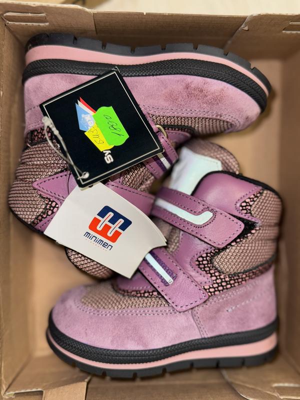 Дуже класні і теплі зимові черевички Minimen для дівчинки Матеріали : Замша+мембранна непромокаюча тканина Захищений носок Утеплені натуральною овчиною Застібаються на липучках ✅Світловідбиваючі елементи на застібках та на язичку Розмір 22 Довжина устілки 15 см (14,5) - на фото є Гарний рожево-ліловий колір Прикрашені мерехтливим золотистим напиленням Дитина буде задоволена Ціна 1750 грн. Торг