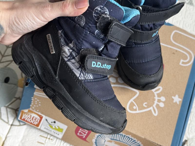 Стелька 15.5 см Зимові водонепроникні мембранні черевики DDStep (Угорщина). Спеціально розроблена система Aqua-TEX запобігає попаданню вологи у взуття. Зверху еко шкіра і спеціальний міцний текстиль зі спеціальним тефлоновим покриттям, усередині мембрана, яка перешкоджає попаданню вологи всередину. Усередині густе і м'яке хутро напівшерсть. Модель передбачена на морози. Черевики мають липучки і дозволяє швидко та легко взути. Підошва гумова, дуже щільна, нос черевика прогумований, що запобігає взуттю від деформації та пальчики від ударів. За вагою черевики дуже легкі. Устілка вбудована в підошву (перевірено - робили розріз черевика). В минулорічних моделях були зауваження, що устілка постійно ковзала, тому її вбудували в підошву. Черевики стали ще зручнішими! Черевики Aqua-TEX від D.D.Step, ddstep, ддстеп - завжди теплі та сухі ніжки у вашої дитини