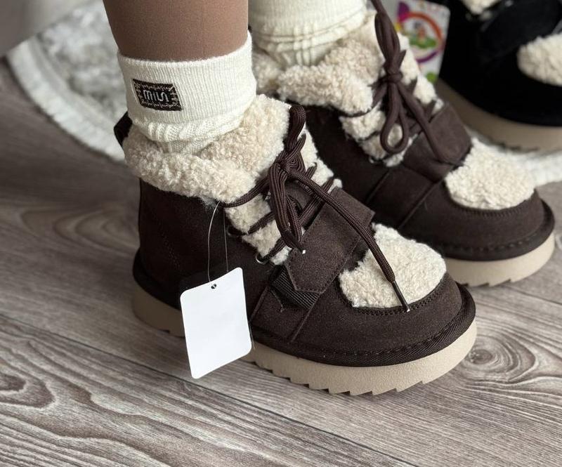 Верх замш Прошиті, приклеяні Мають широку липучку Фіксація шнурівкою Утеплені густим теплим хутром (65% натур) Якість супер 26 розмір 16,5 см 27 розмір 17,2 см 28 розмір 17,8 см 32 розмір 20 см рекомендований запас 0,5 см