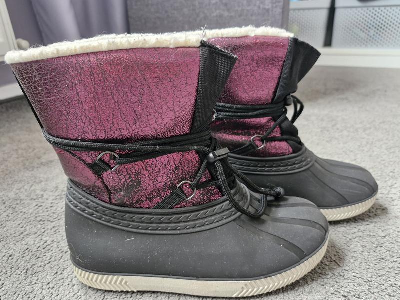 Сапоги на снег/дождь для девочки 34-35 размерка, стелька около 22,5-22,8 см (стеклолдно измерить). Уже не "першей свежести", потому что ребенок отходил два сезона. Но они качественные и не протекают. Зайвыми точно не будут.