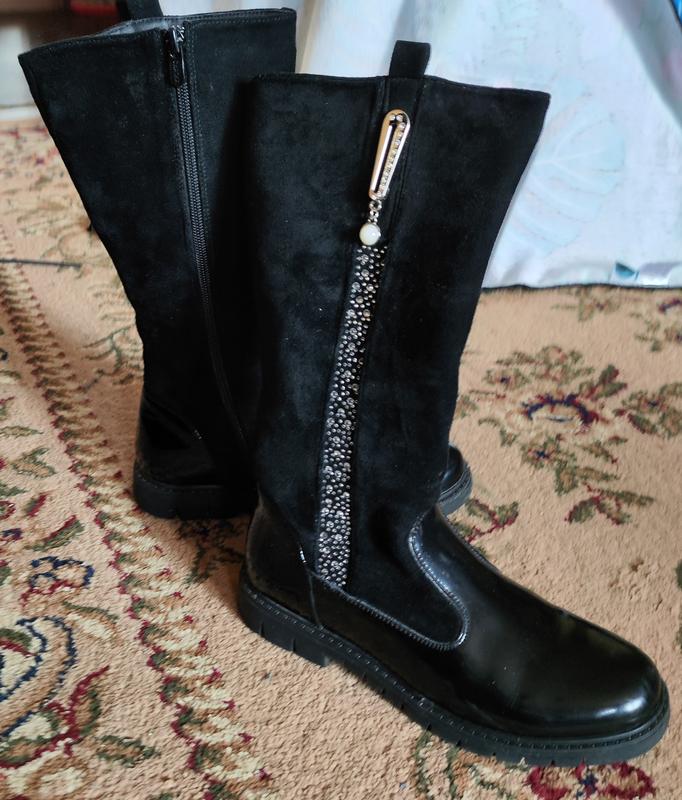 Сапоги на девочку, весна -осень, теплая зима, с утеплением по всей высоте сапожка. Верх комбинированный лакированная кожа и искусственный замш. Застежка молния. Декорированы камушками, которые красиво блестят. Есть маленький каблукчик (каблук).
