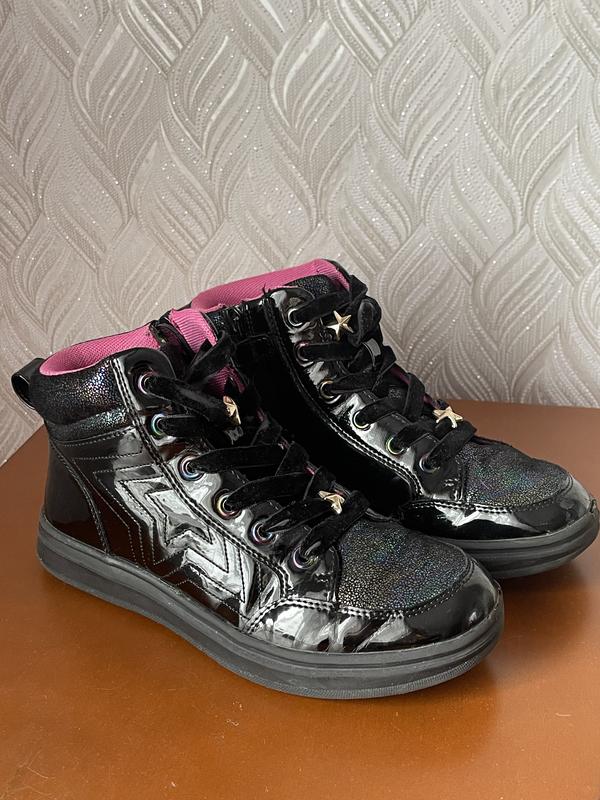 Ботинки демісезон для дівчинки. Лаковані, шкіряна устілка, підошва має приємний аромат карамельок) Виробник Cool Club. Застібка-блискавка збоку, але можна і шнурівкою. Має незначну здертісті на одному ботинку спереду.