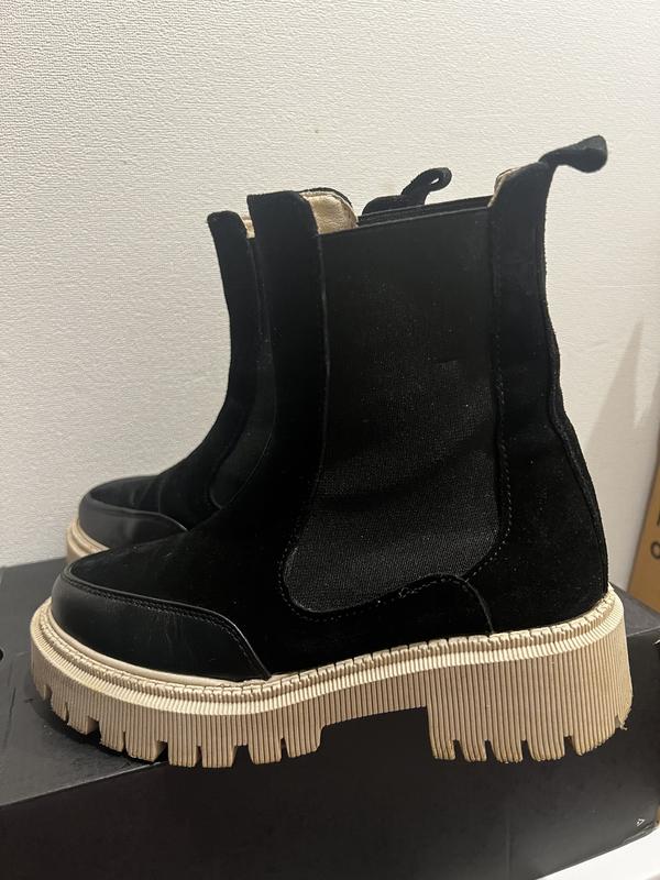 Шкіряні з замшевими вставками Чорні челсі розміром 33-34, устілка 21,5 см, на вовняній підкладці, теплі і зручні, на вузьку ніжку