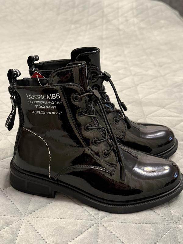 Стильні демісезонні черевики 35 розмір Модні лаковані черевики чорного кольору. ✔️ Розмір: 35 (довжина устілки приблизно 22см) ✔️ Матеріал: еко-шкіра лак ✔️ Усередині — текстильна підкладка (фліс) ✔️ Зручна еластична шнурівка + замочок збоку ✔️ Підошва гума, не слизька ✔️ Легкі, комфортні, гарно виглядають на нозі Підійдуть для осені або на весну. Універсальний дизайн — підходять і під штани, і під сукню.
