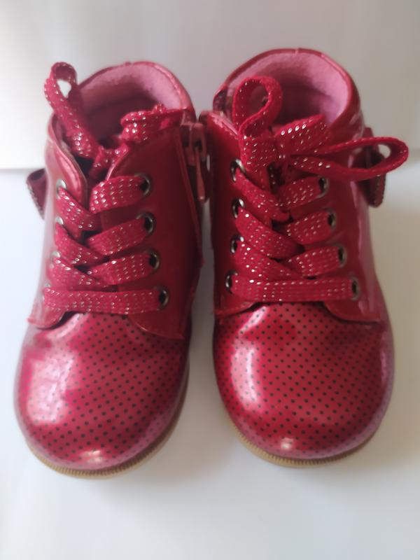 длина по подошве снаружи 15,5 см, ширина 6,5 см, высота 7,5 см, спереди шнуровка, с внутренней стороны молния 6 см, внешняя сторона украшена бантиком со стразами, передняя часть красная в черную капленку, задняя часть верха объемная и мягкая, чтобы не дало ножки, утепленные, яркие, нарядные, в отличном состоянии