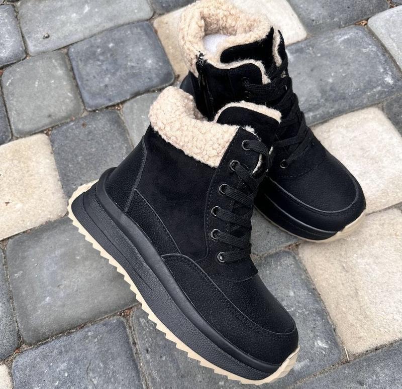 Верх якісна еко-шкіра та комбінація хутра тедді, легкі. Фіксація шнурівка та боковий замочок Всередині тепле хутро (60%овчина) Устілка також утеплена +супінатор Стильні та зручні! 32р - 20.5 см 33р - 21.0 см 34р - 21.5 см 35р - 22.3 см