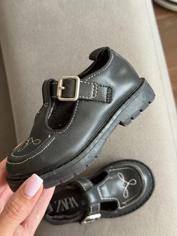 Б/у Класичні та стильні дитячі туфлі Zara з Т-подібними ремінцями та ніжною білою вишивкою на носку. Регульована застібка на липучці з декоративною пряжкою та задньою стрічкою для легкого одягання. Гнучка гумова підошва забезпечує комфорт та зчеплення.