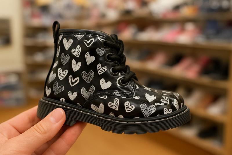 Тімби в сердечка для стильних і модних дівчат! Виконані в лаковій екошкірі, всередині утеплені флісом! Устілка шкіряна з супінатором! Підошва гнучка та легка гума, є каблук Томаса! Підйом ніжки регулюється шнурівкою, а збоку є замочок Дуже практична та комфортна модель Розміри: (похибка вимірів устілки +/- 2 мм) ЧОРНІ: 23р – 14,3 см Рожеві 23р-14,3см