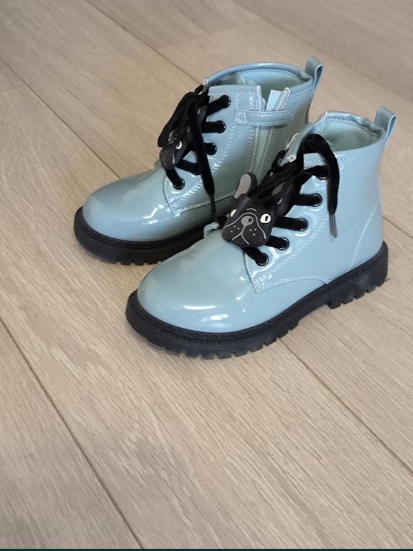 Стильні дитячі черевики Матеріал: лакована екошкіра Колір: ніжно-блакитний Зручна підошва з протиковзким рельєфом Застібка-блискавка збоку + шнурівка для ідеальної фіксації Декор з милим собачкою на шнурівці Легкі, зручні та практичні для щоденного носіння Підійдуть для прогулянок восени та навесні Розмір : 31р - 19см
