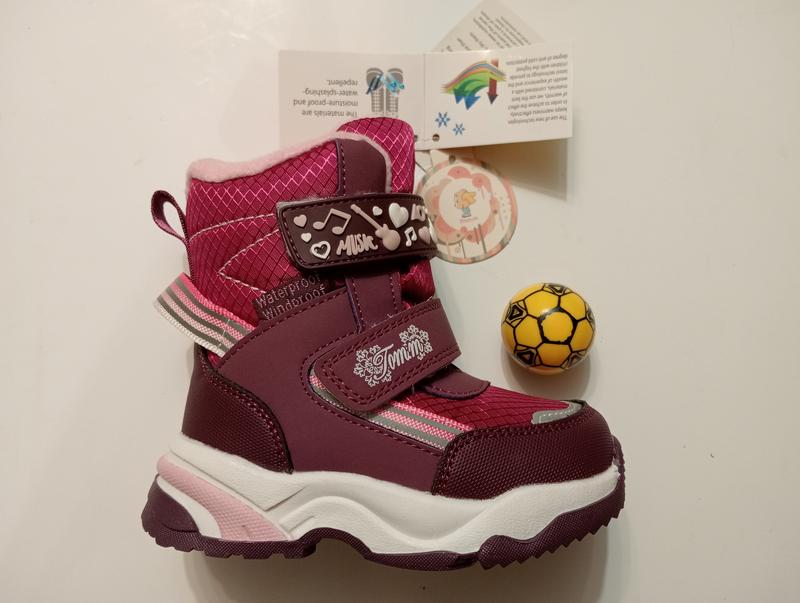 В наличии зимние сапожки ТМ Tom.m Внешний материал: искусственная кожа + ветрозащитный и водоотталкивающий материал Материал внутри и стелька: искусственный мех Подошва износостойкая, прочная, устойчивая к скольжению. Застежка липучка Сапоги удобные, теплые, легкие, красиво смотрятся на ножке. Замеры по стельке от края до края: 22р. - 14 см 23р. - 15 см 24р. - 15,5 см 25р. - 16,5 см 26р. - 17 см 27р. - 17,5 см