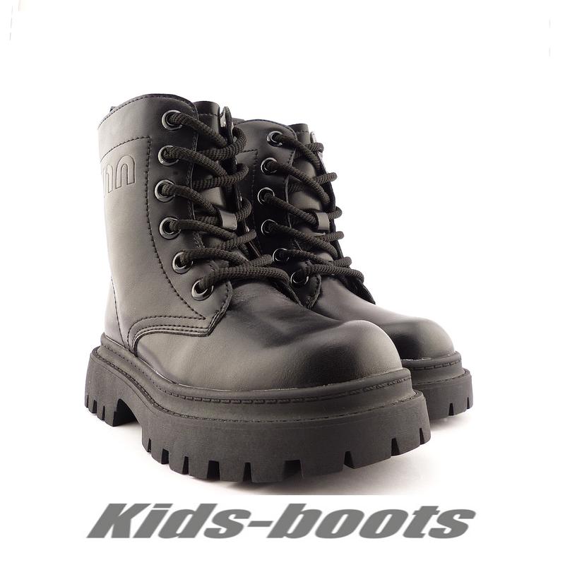 Ботинки изготовлены из искусственной кожи. Основной цвет верха - черный. Материал подкладки - набивная шерсть белого цвета. Стелька – вынимается, изготовлена из набивной шерсти белого цвета. Обувь не впитывает влагу, и отлично поддерживает комфортную температуру для тела. Имеет легкую и упругую подошву. Застежка – молния и шнурки. Размеры; обувь / стельки, см -32/21 cm; 33/21,7cm; 34/22,5cm; 35/23cm; 36/24cm; 37/24,5cm.