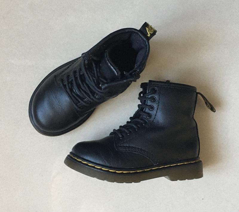 Оригінальні черевики англійської фірми DR. MARTENS в ідеальному стані. Модель DR. MARTENS 1460 TODDLER SOFTY T LACE-UP LEATHER BOOTS. Натуральна шкіра. Підошва із поліуретану. Підошва прошита. Бокова блискавка (не потрібно шнурувати). Взували кілька разів (дивіться фото підошви і середини). Ціна нових на останньому фото.