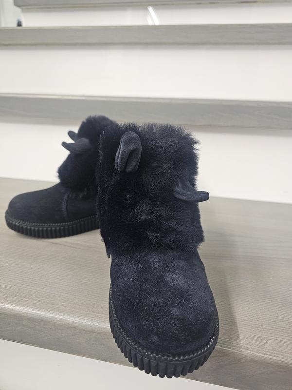 Зимние ботиночки с ушками, из натуральной замши. Ботинки из витрины!! имеют на одном ботиночку изменение цвета, выгорели.Внутри овчинка, сбоку замок с двух сторон, очень теплые, мягкие и удобные. Размеры и длина по стельке: 31-19.5см, 32-20см