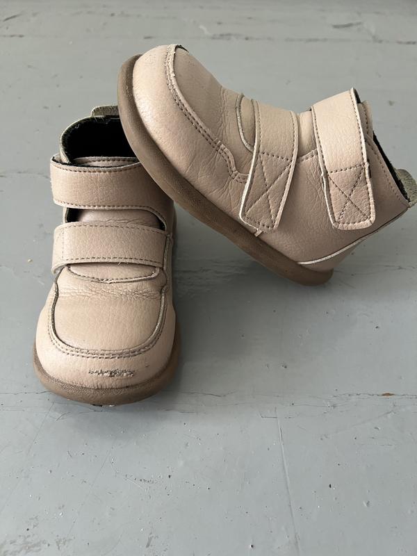 Шкіряні осінні чоботи на флісі з широким носком. Застібаються 2 ліпучками. Підійдуть на широку ніжку. Носки трохи подерті, на фото видно. Заміри на фото
