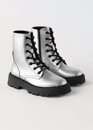 Цвет: Серебристый, металлик. Стиль: Берцы на массивной черной подошве. Детали: Черные шнурки и боковая молния.