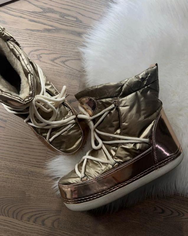 ✨ Стильні зимові дутики–луноходи кольору темного рожевого золота Яскрава пара для тих, хто любить тепло й виділяється з натовпу 💖 🔸 Колір: рожеве золото — модний металевий відтінок 🔸 Фасон: об’ємні луноходи/дутики на шнурівці 🔸 Матеріали: непромокаючий верх, усередині — мех + утеплювач 🔸 Розмір: 39 (стелька 25,5 см) 🔸 Підошва: масивна, не ковзає, зручна для зими 🔸 Стан: дуже хороший, є заломи спереду від носіння Ідеальна пара для морозів — зручна, модна й додає образу сяйва ✨ Купила на шафе,перепродаю!Есть следы носки ,на загибах